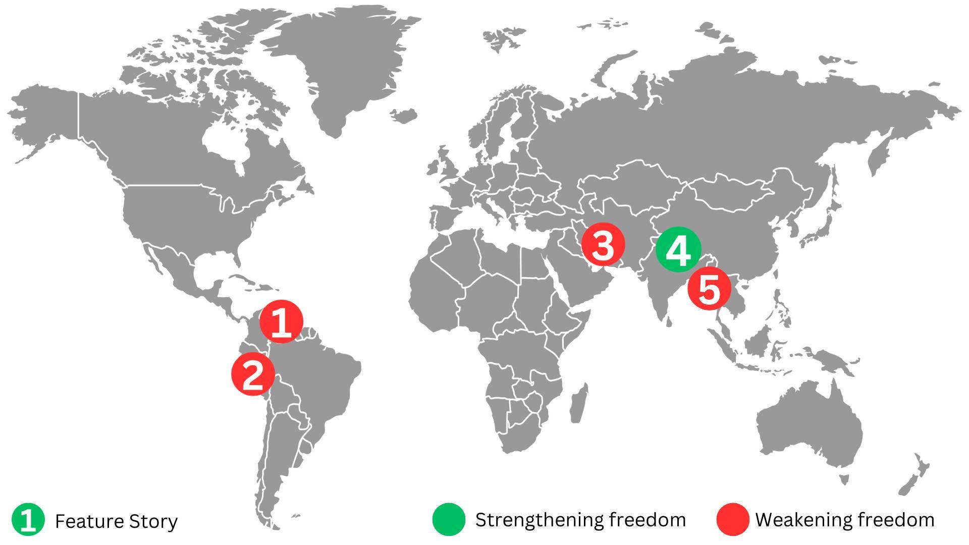 Country names are followed by their 2025 freedom scores according to Freedom House, which will publish its 2026 scores later this month. Not a ranking.